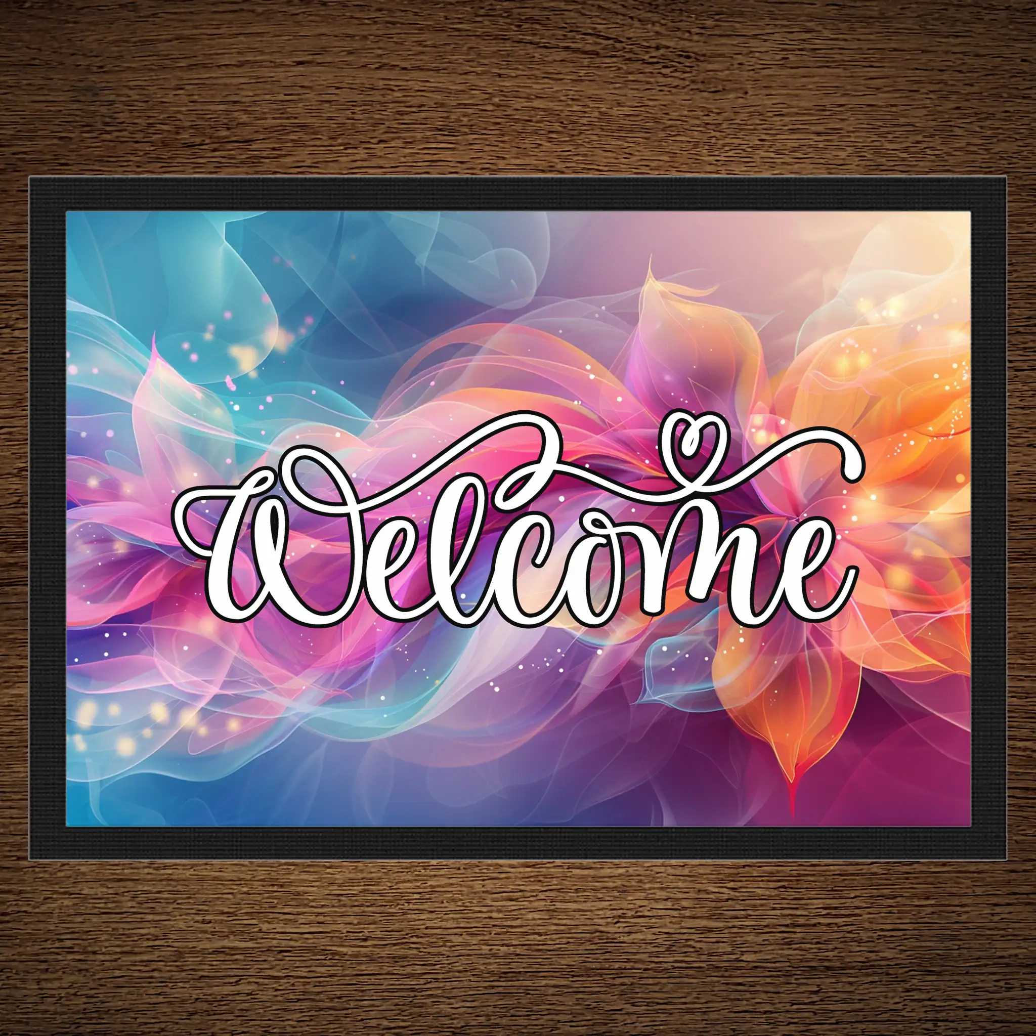 Hergestellt aus Polyester mit schwarzem Gummirand und rutschfester Rückseite, bietet unsere Fußmatte Welcome eine ansprechende Optik mit optimaler Farbbrillanz und brillantem Druck in Fotoqualität. Diese Fußmatte sieht aber nicht nur super aus, sondern nimmt auch zuverlässig Schmutz, Staub und Nässe auf und sorgt so für Sauberkeit und Hygiene im Eingangsbereich. Dies macht sie zu einem äußerst praktischen Begleiter im Alltag oder ist ideal als Geschenk für eine Mitteilung und Freude zu verbreiten.