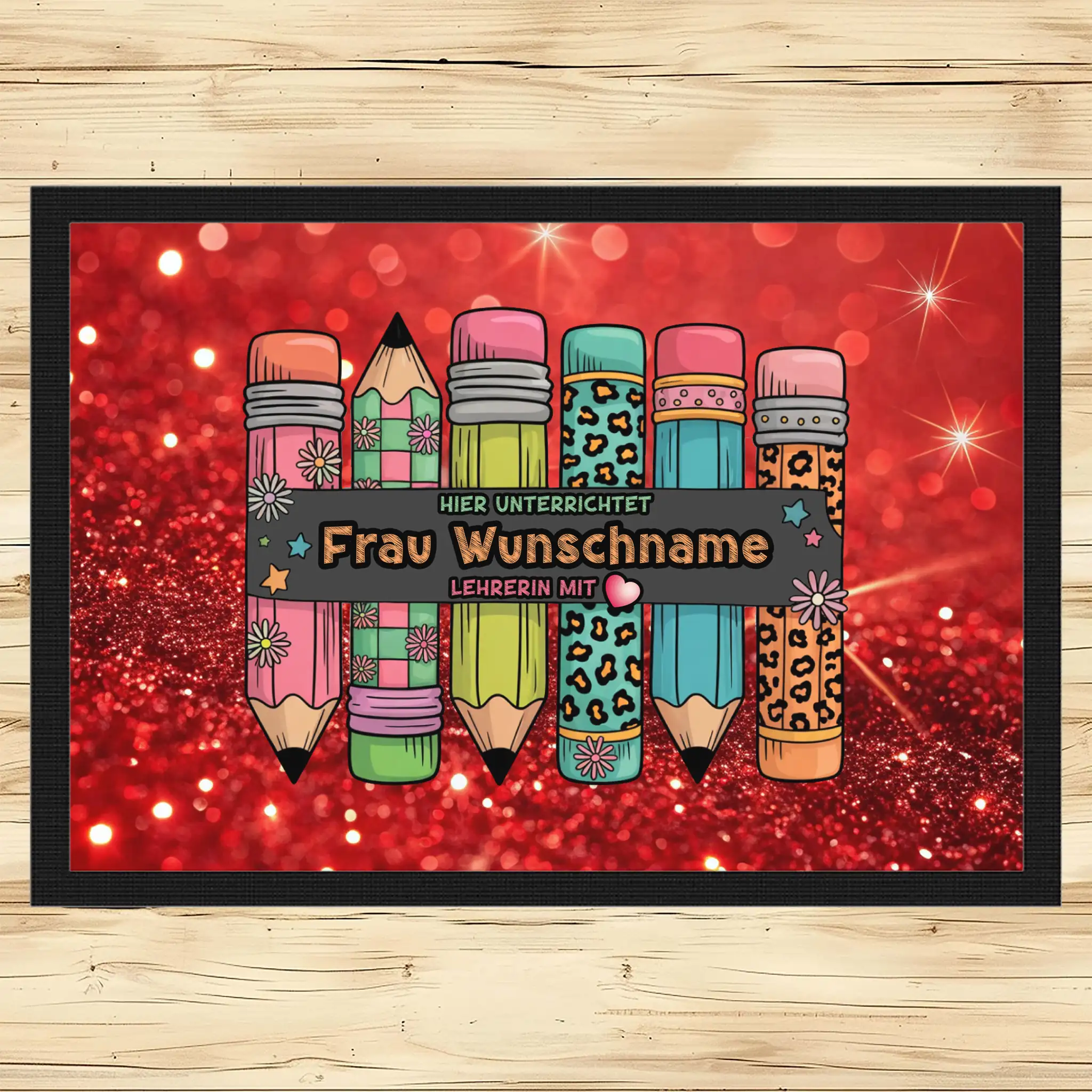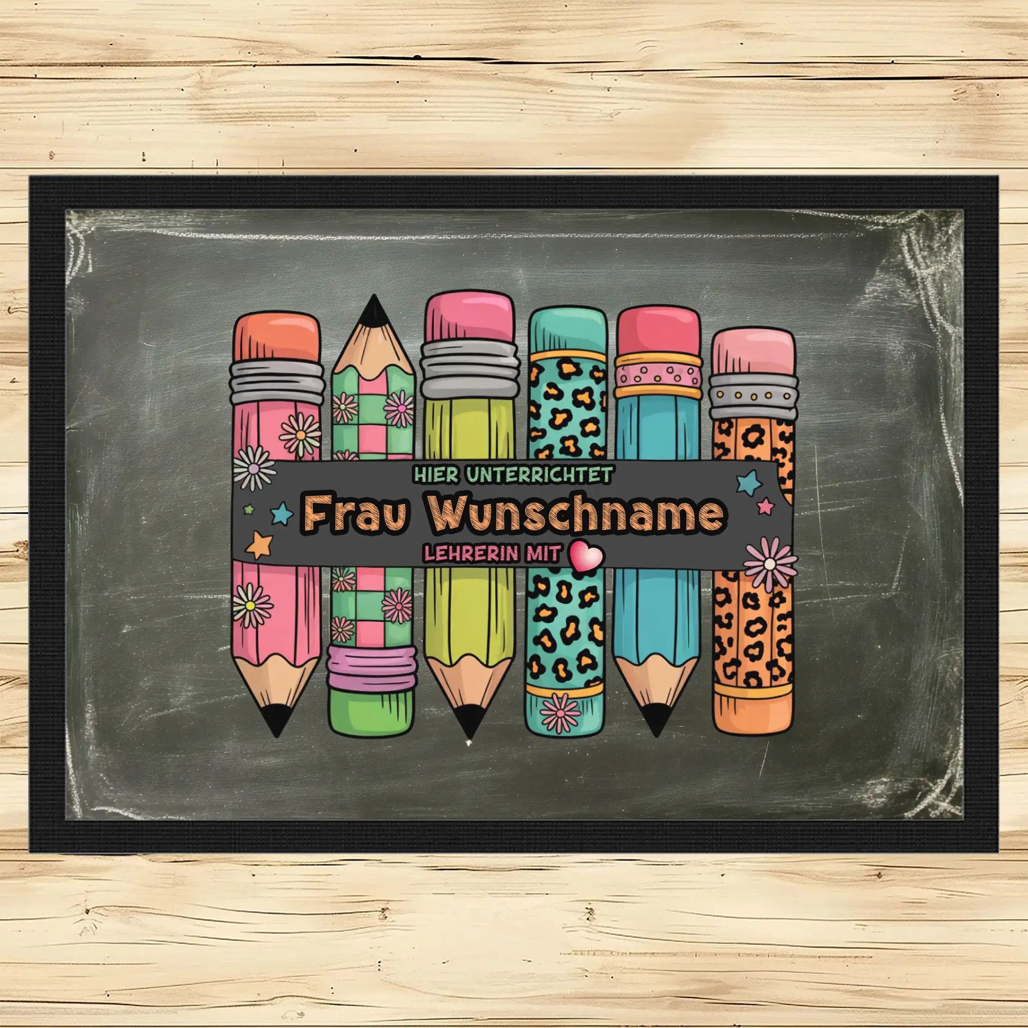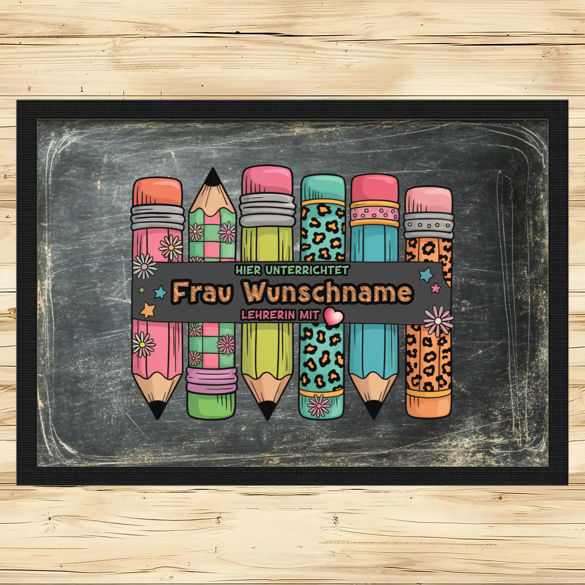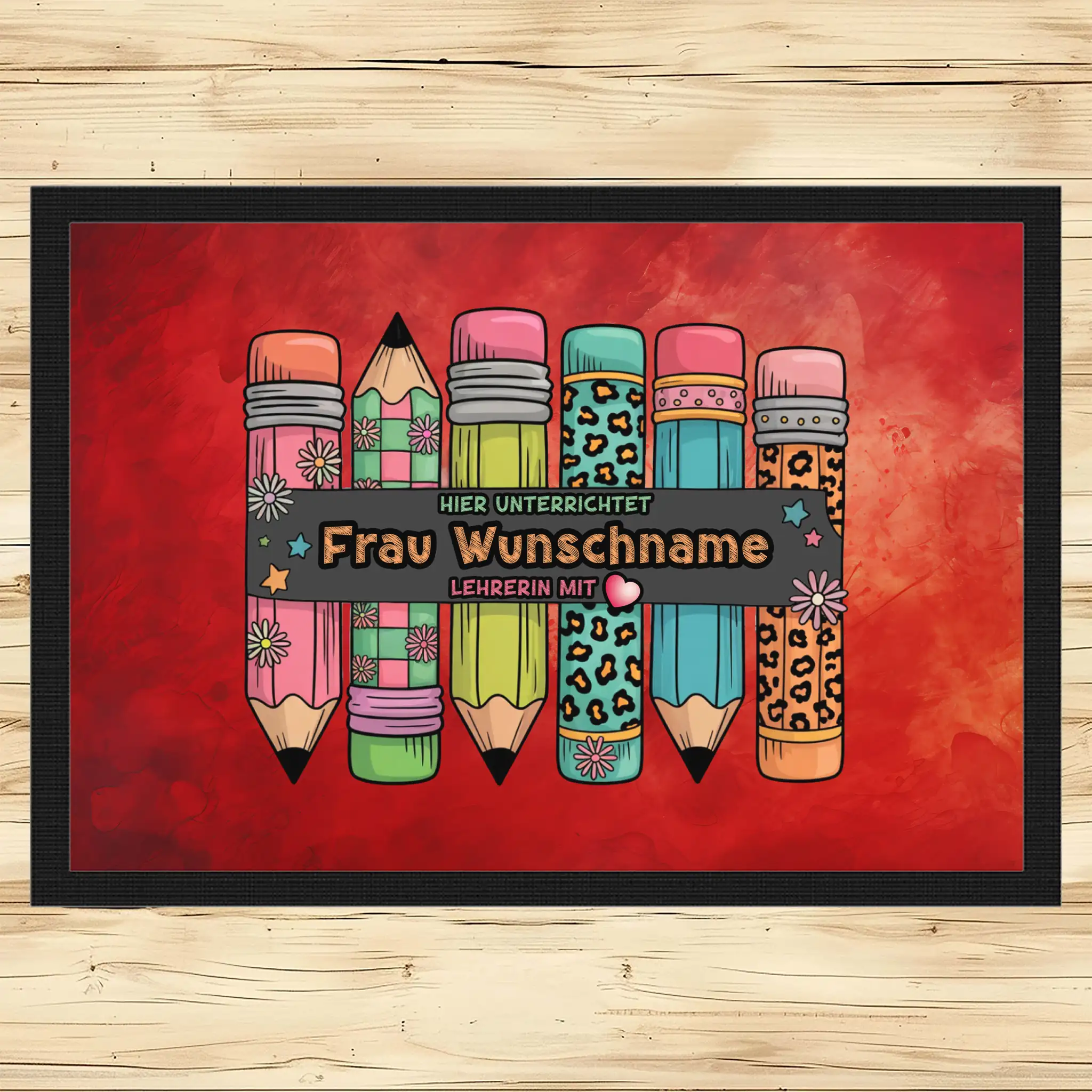 - Motiv / Thema der Fußmatte: Fußmatte Hier unterrichtet Frau Wunschname Lehrerin mit Herz