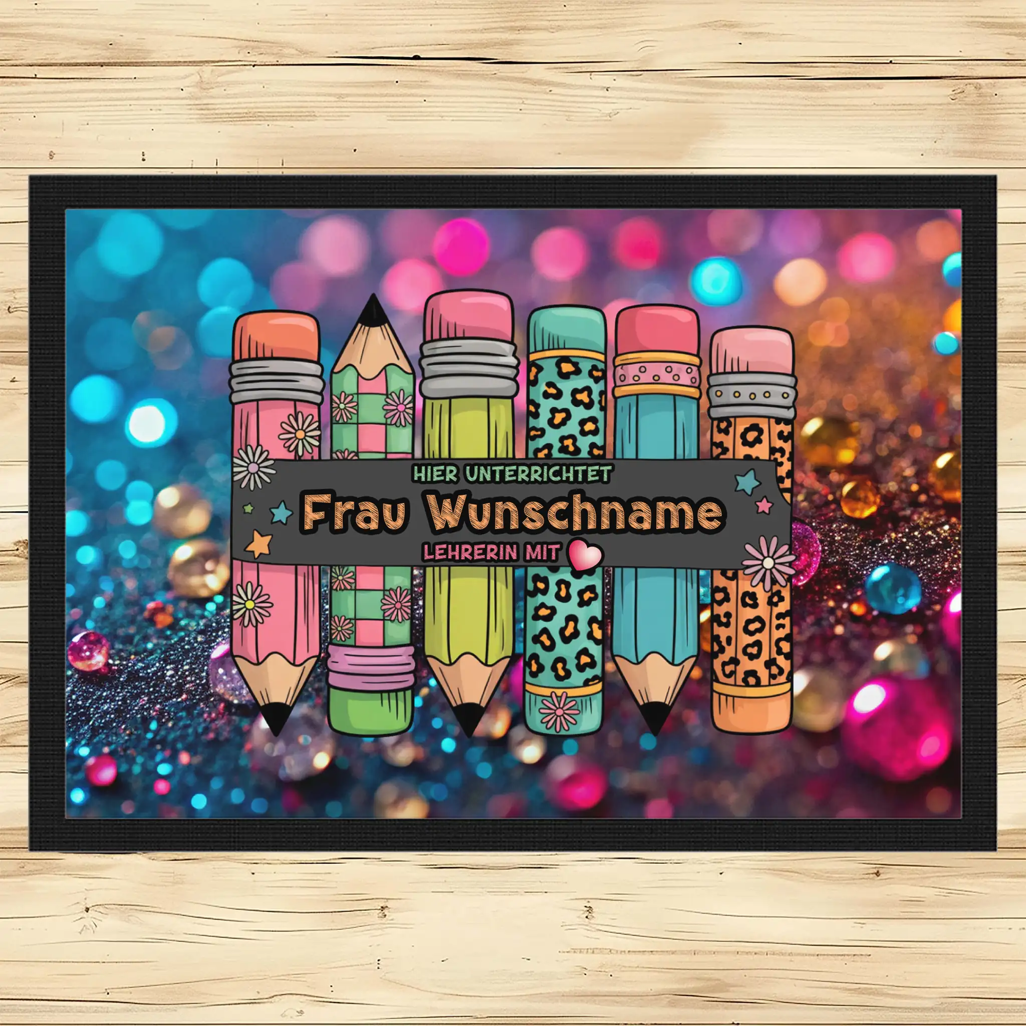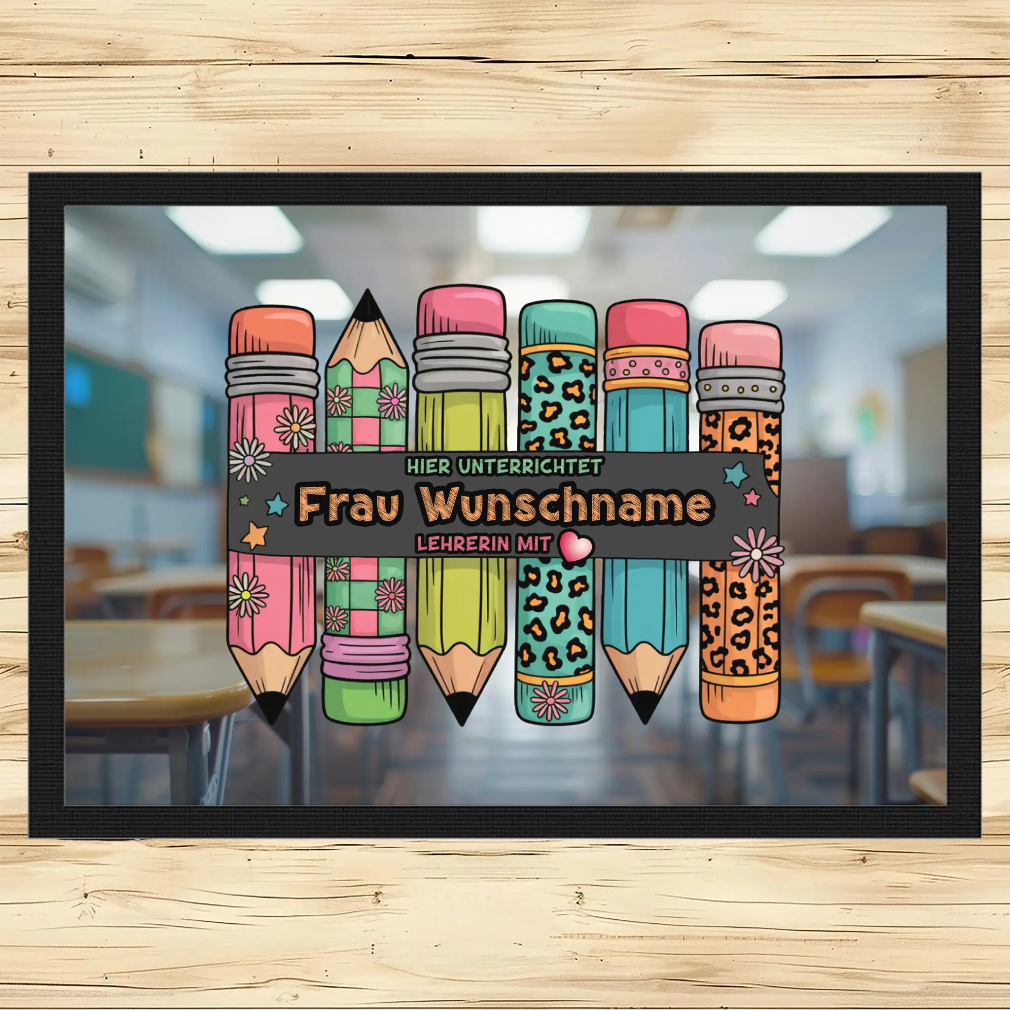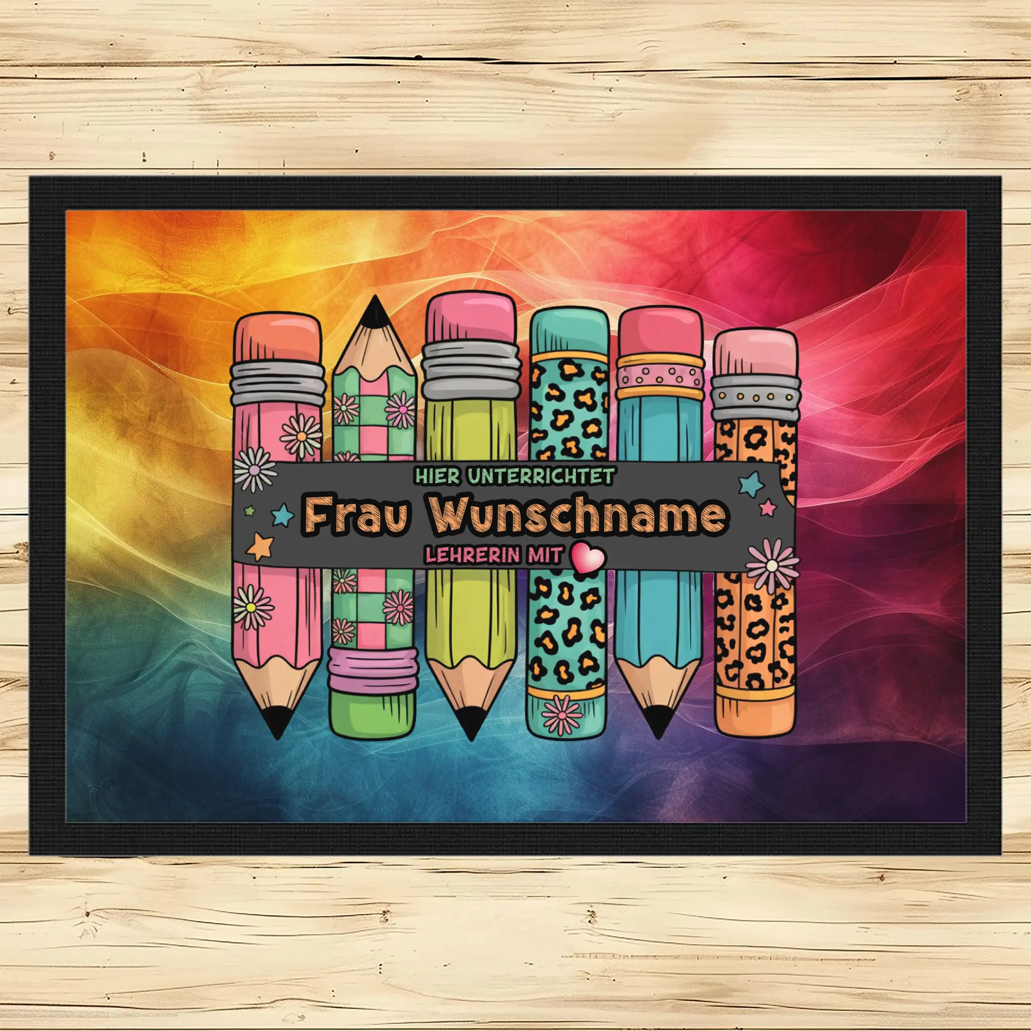 - Motiv / Thema der Fußmatte: Fußmatte Hier unterrichtet Frau Wunschname Lehrerin mit Herz