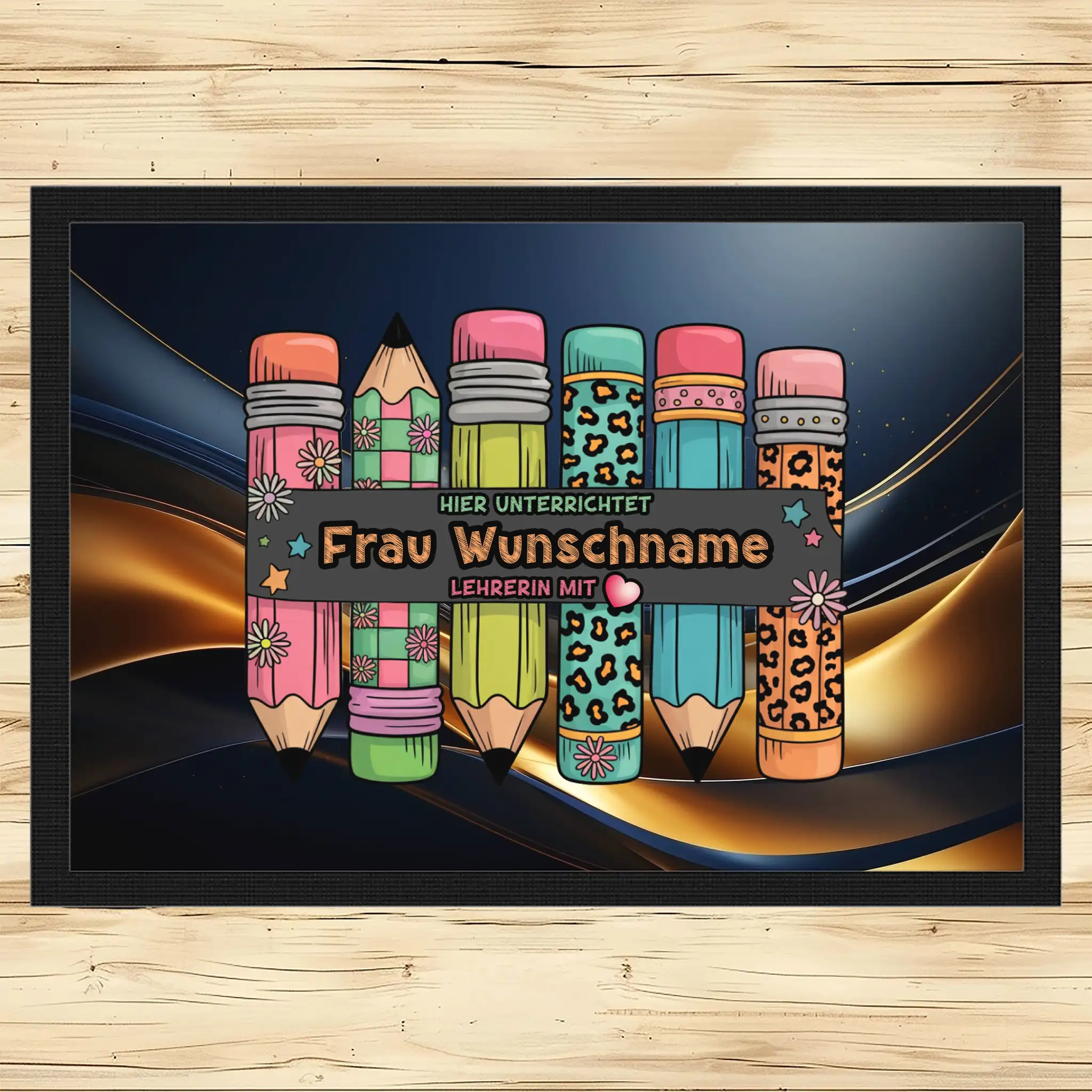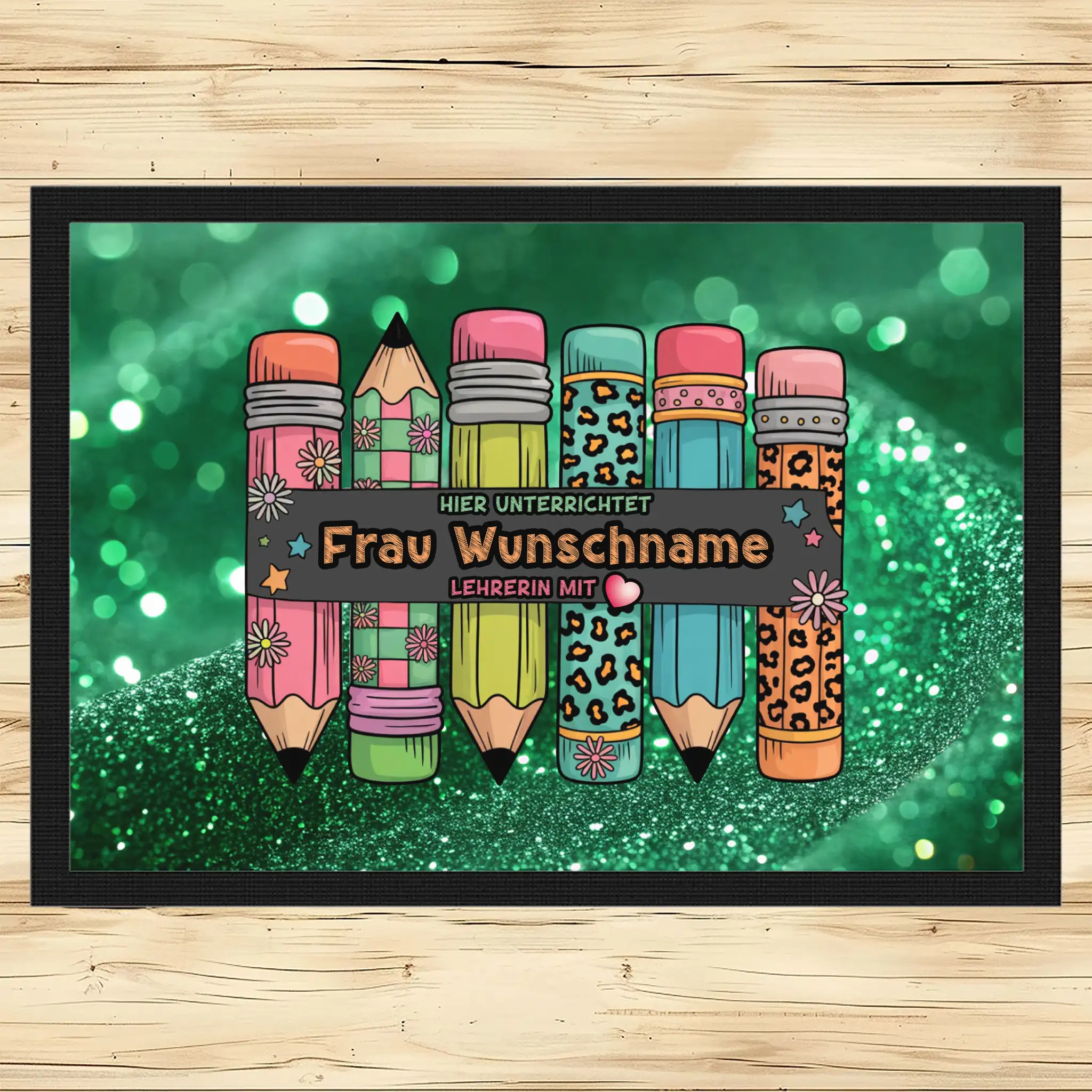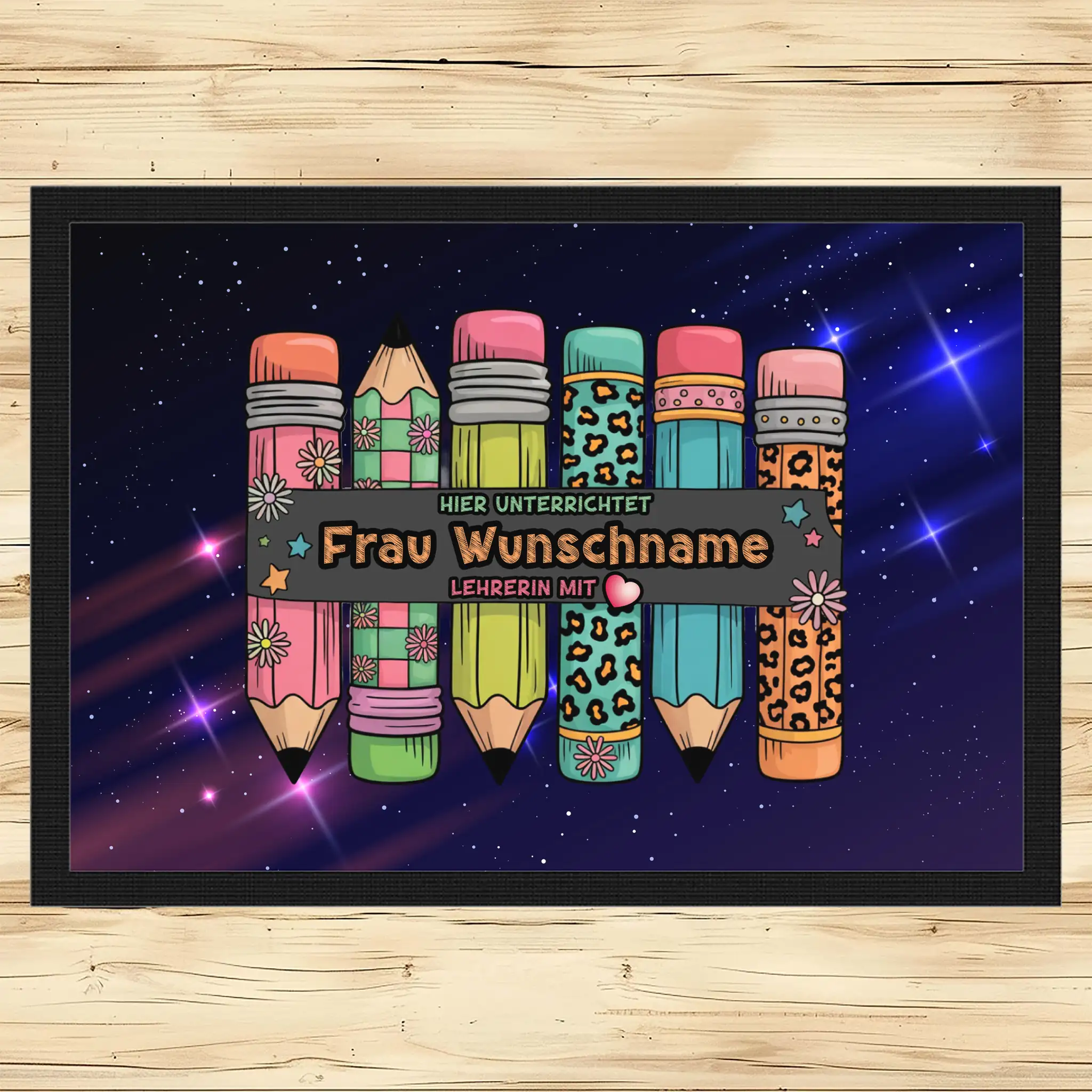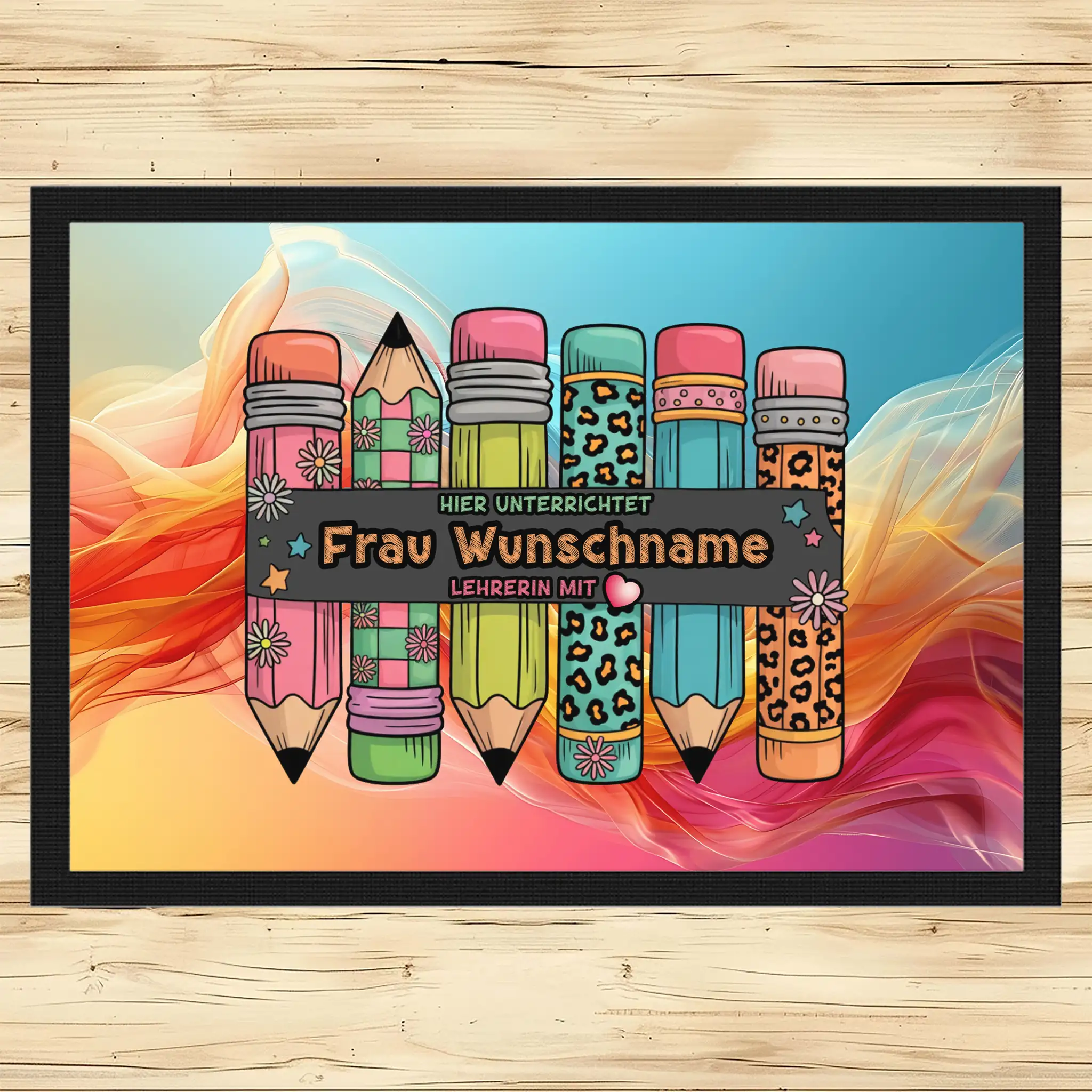- Motiv / Thema der Fußmatte: Fußmatte Hier unterrichtet Frau Wunschname Lehrerin mit Herz