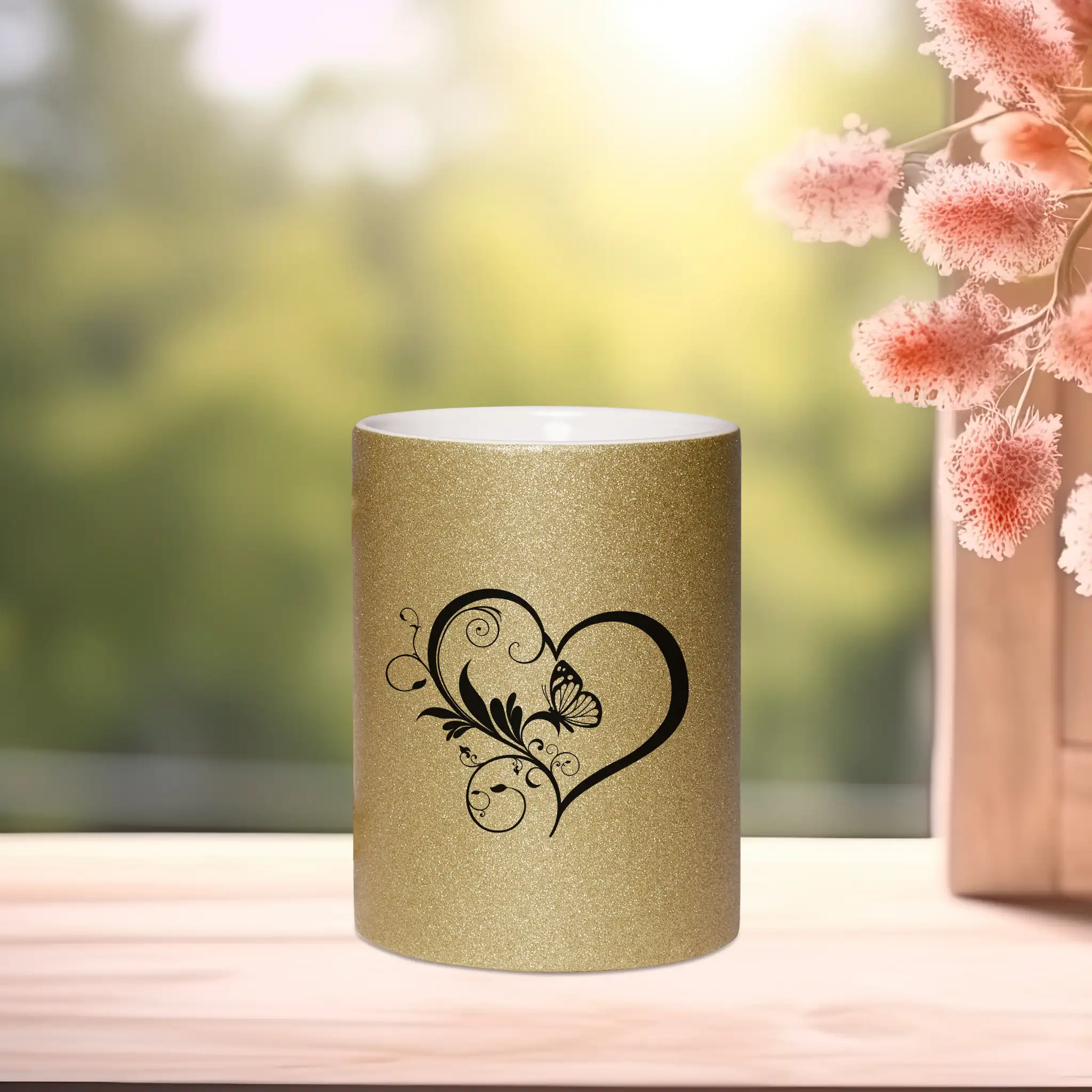 Zusätzlich hast Du bei dieser Glitzertasse Tolle Lehrer sind schwer zu finden noch ein wunderschönes Schmetterling im Herz Motiv. So wird sie zu einem ganz persönlichen Geschenk, das von Herzen kommt und garantiert für Freude sorgt. Lass Deiner Kreativität freien Lauf und gestalte diese Tasse ganz nach Deinen Vorstellungen. Ohne Angabe eines Wunschtextes bleibt dieser Bereich natürlich frei.