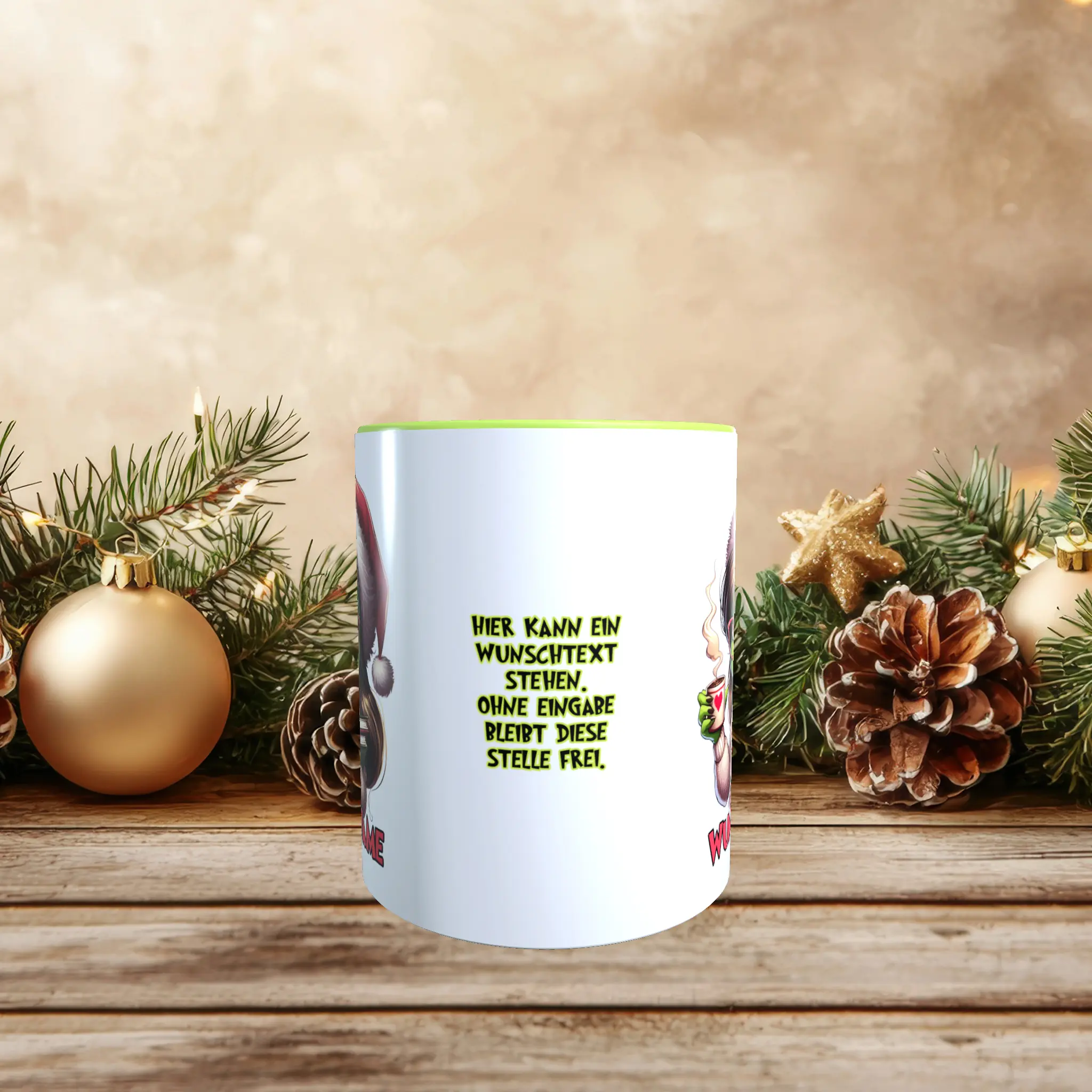 Zusätzlich hast Du bei dieser Tasse Grinch Frau die Möglichkeit, einen optionalen Wunschtext hinzuzufügen, um die Tasse noch individueller zu gestalten. So wird sie zu einem ganz persönlichen Geschenk, das von Herzen kommt und garantiert für Freude sorgt. Lass Deiner Kreativität freien Lauf und gestalte diese Tasse ganz nach Deinen Vorstellungen. Ohne Angabe eines Wunschtextes bleibt dieser Bereich natürlich frei.