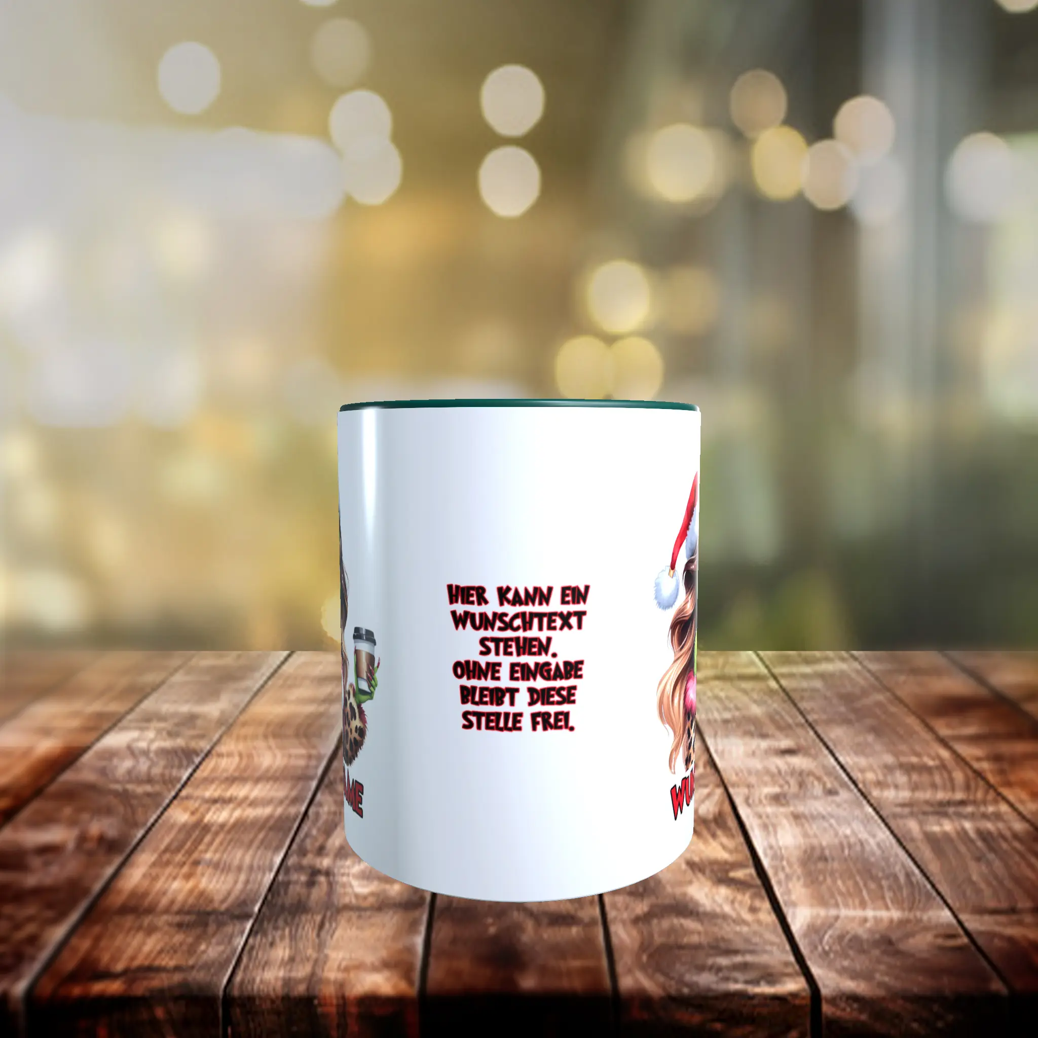 Zusätzlich hast Du bei dieser Tasse Mrs Grinch die Möglichkeit, einen optionalen Wunschtext hinzuzufügen, um die Tasse noch individueller zu gestalten. So wird sie zu einem ganz persönlichen Geschenk, das von Herzen kommt und garantiert für Freude sorgt. Lass Deiner Kreativität freien Lauf und gestalte diese Tasse ganz nach Deinen Vorstellungen. Ohne Angabe eines Wunschtextes bleibt dieser Bereich natürlich frei.